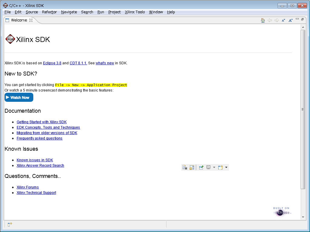 40. Welcome Xilinx SDKと書かれた画面が出るので、ページの×を押して閉じます。