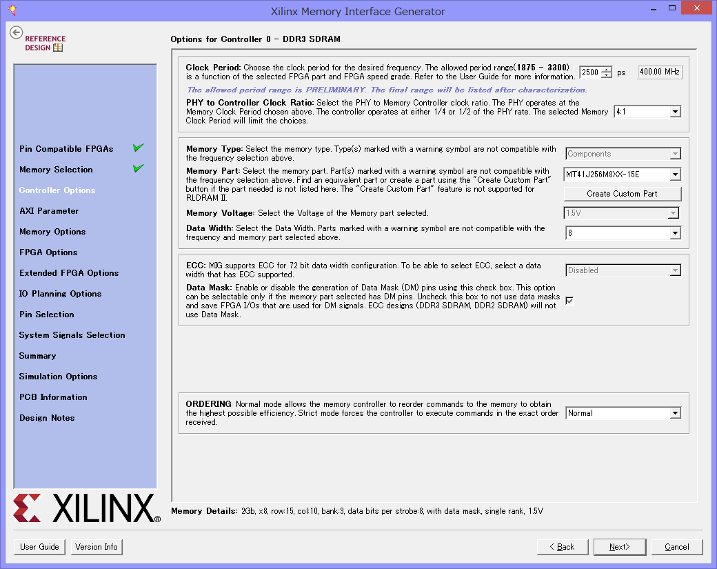 メモリPartは、MT41J256M8XX-15Eを選びます。アドレスの幅や各種パラメータが参照されるだけなので、使用する部品と全く同一でなくても構いません。