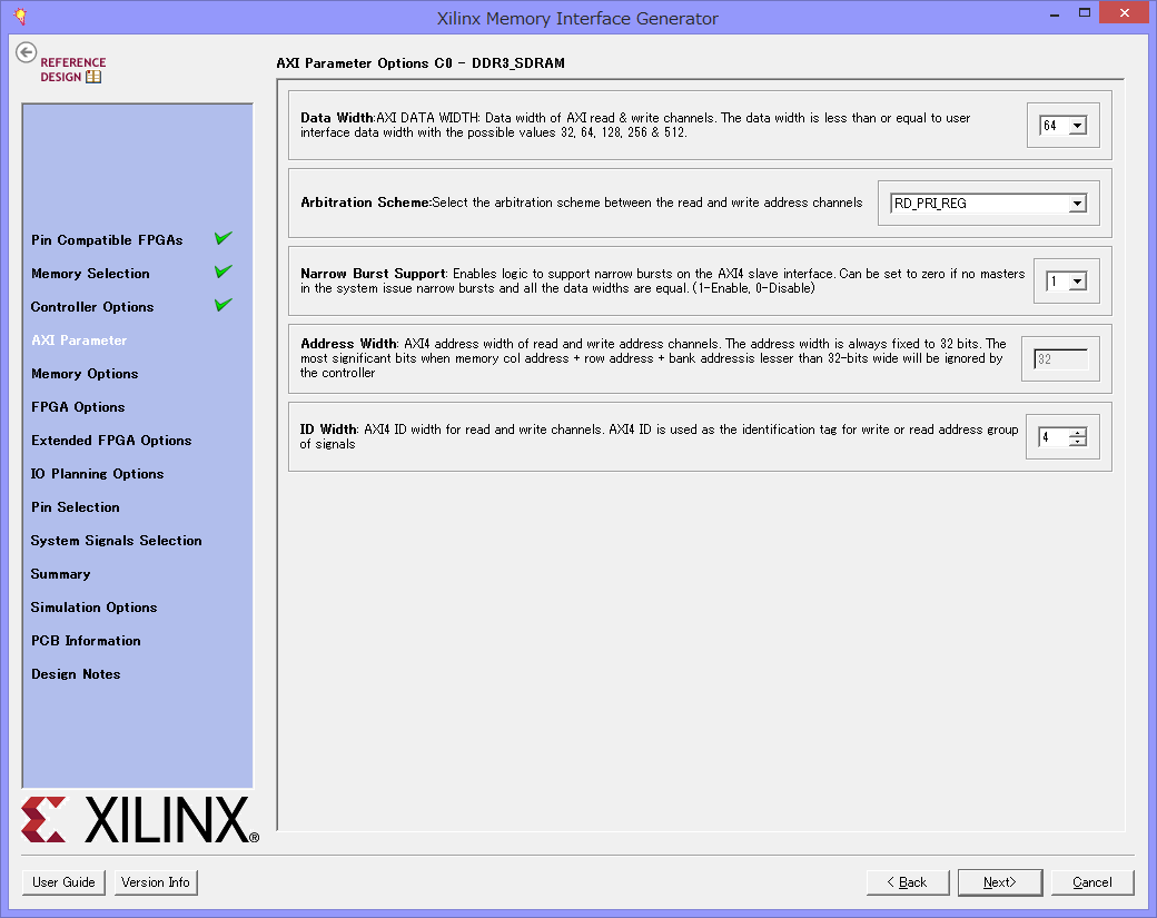 次の画面は特に変更ありませんが、データ幅64bitというところに注目してください。8bitのDDR3 SDRAMですが、8バイト分のデータをためて一気に送るということです。