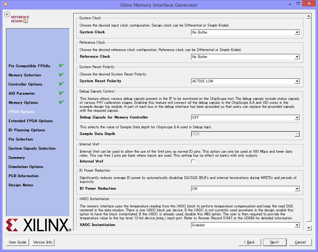 クロックにバッファを通すか、リセットの極性などを指定します。