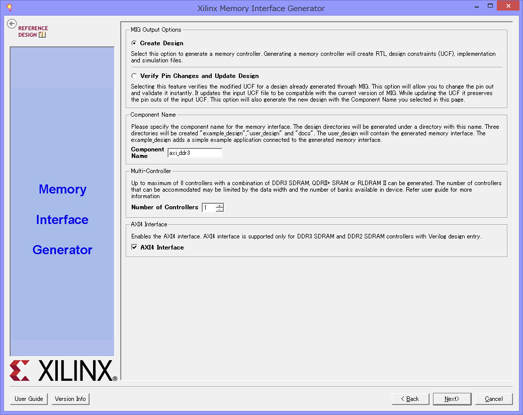 最初にデザインを作るときにはCreateDesignを選びます。MultiControlerは1で、AXI4をチェックしておきます。