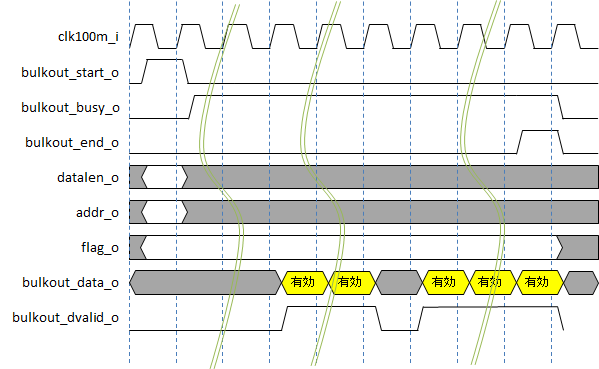 ホストPCからOUT転送が発行されると、bulkout_startが1クロックの間アサートされてOUT転送が発生したことを知らせます。その後、その一連のOUT転送が継続している間はbulkout_busy_oが'1'なります。OUT転送が終了するときに、bulkout_end_oが1クロックの間'1'になります。