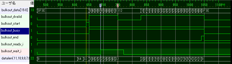 次の図は、ユーザ回路がWAITをかけた場合です。bulkout_wait_iがアサートされてから実際のデータが停止するまでに6クロックかかっていることがわかります。
