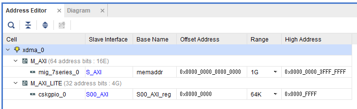 M_AXIの0~0x3fffffffをMIG(DDR3)に割り当て、M_AXI_LITEの0~0xffffをCSKGPIOに割り当てています。