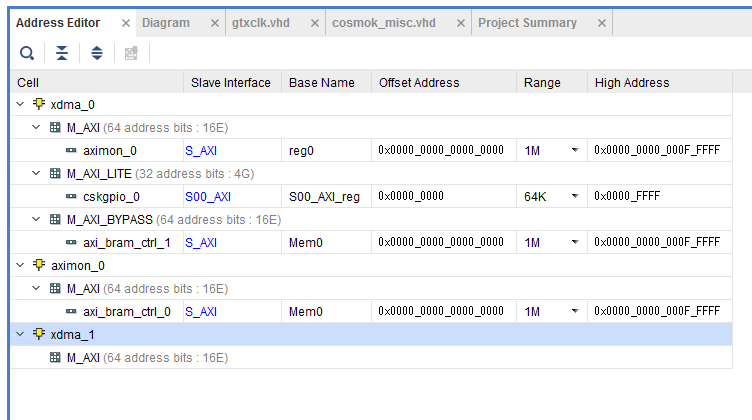 | M_AXI_BYPASS | BAR2に割り当てられています。PCからBAR2空間にアクセスすると、M_AXI_BYPASSのポートからマルチワードのトランザクションが発行され、block_ramにアクセスします。 |