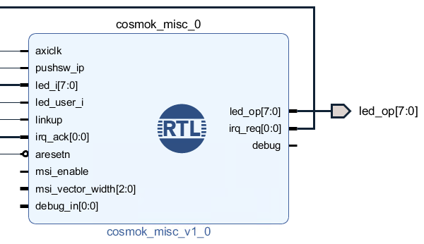 Cosmo-K用のGPIOコアです。GPIOだけではなく、ボード上のGPIOやLED、DIP SWの制御と、内蔵レジスタの実装、バージョン番号の管理を行っています。 |