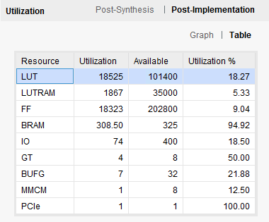 サンプルデザインを論理合成し、XC7K160Tに実装したときのリソース使用量を以下に示します。