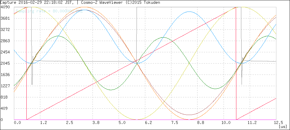 下の図は、入力信号の振幅を変え、Cosmo-Z内でディジタル的に計算した正弦波と乗算しているようすです。