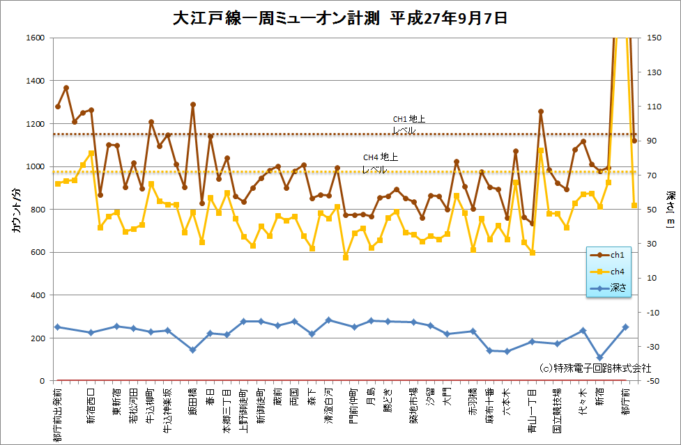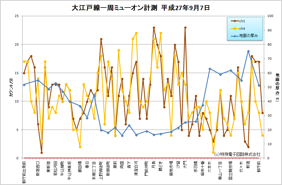 9月7日、弊社スタッフが、Cosmo-Zを持って都営大江戸線を一周して、宇宙線+バックグラウンドの量を測ってきてくれました。