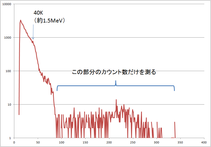 この高さの分布からエネルギーの分布が求められますが、高エネルギーのものだけをカウントするようにします(ディスクリという)。こうすることで、40Kやラドン娘核からのγ線、その他ノイズを排除できます。