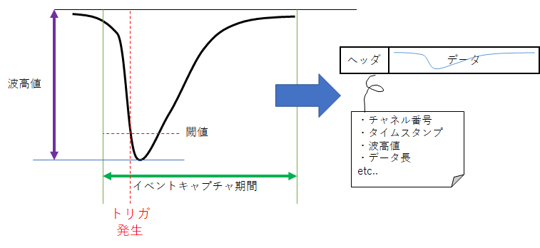 イベントキャプチャの際には、FPGAのハードウェアにより波高値とイベントが発生した時刻などを合わせて記録し、ヘッダとしてデータの前に付加します。