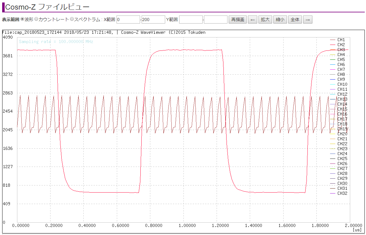例1 100MHz 2chで、矩形波などを200ポイントの長さ同時計測した例