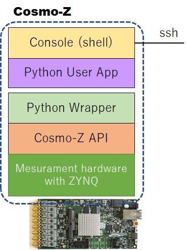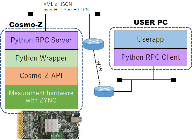 Cosmo-Z上のLinuxのshellの上で動作するPythonアプリを作ることもできますが、PythonのRPC Serverを使えば、同じ機能をLAN/WAN経由でユーザPCからリモート操作することもできます。