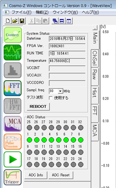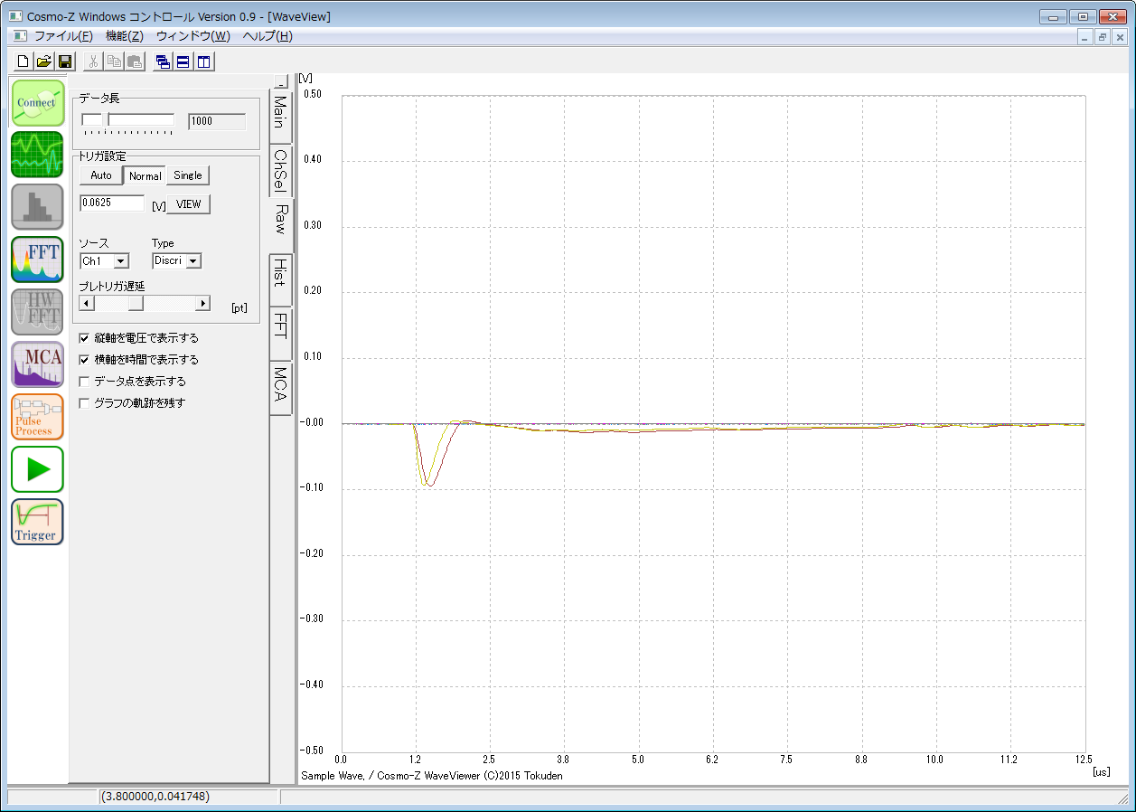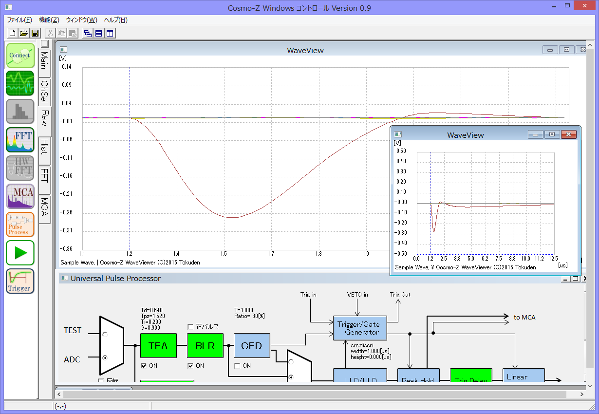 オシロのように波形を見ることもできれば、複数のWindowsを立ち上げて、波形の全体を表示させながら一部を拡大表示したり、放射線のスペクトラムを見るためのMCAも統合されています。