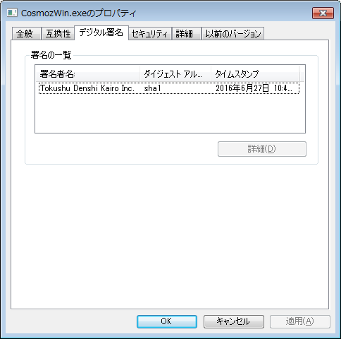 なお、CosmozWin.exeは、Tokushu Denshi Kairo Inc.によってデジタル署名されています。