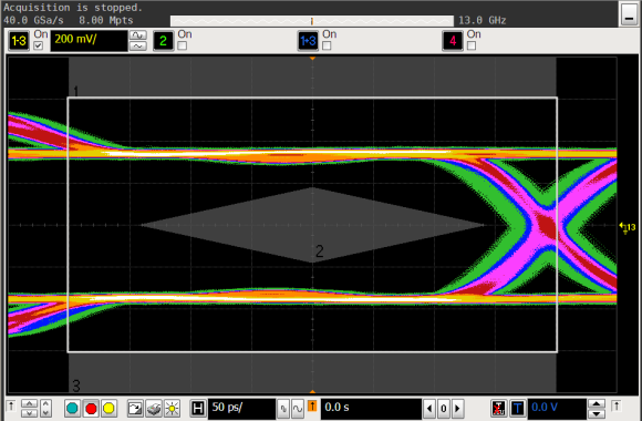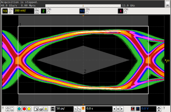 EXPARTAN-6Tが出力する波形のアイパターンを示します。マスクに被っておらず、良好な成績です。