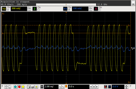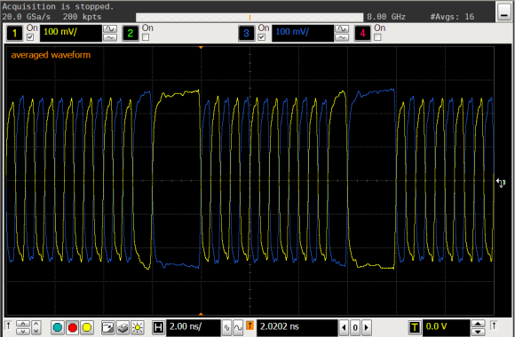 EXPARTAN-6Tが出力する信号波形を示します。なお、PCI Express標準の治具に挿し、コンプライアンスパターンを送出し、2本の差動プローブを用いて測定しています。サンプリング速度は40GSa/sです。