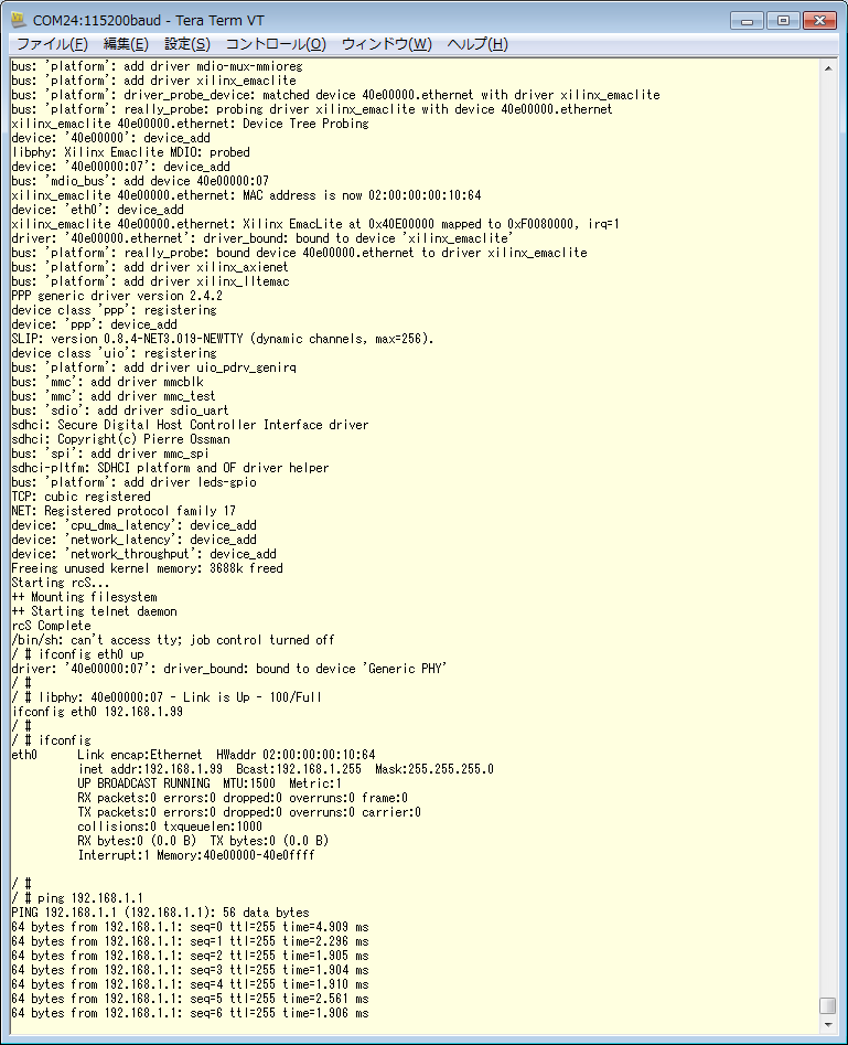 上の図では、MicroBlaze Linuxが起動した後、ifconfigでeth0を有効にし、IPアドレスをセットしてPINGを打っています。