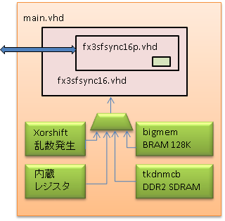 USBに対してデータを送信するモジュール(IN転送時のデータソース)は、XorShift、内蔵レジスタ、BigMem、tkdnmcbの4種類です。これらのどのモジュールが使われるかは、flag[1:0]によって選択されます。