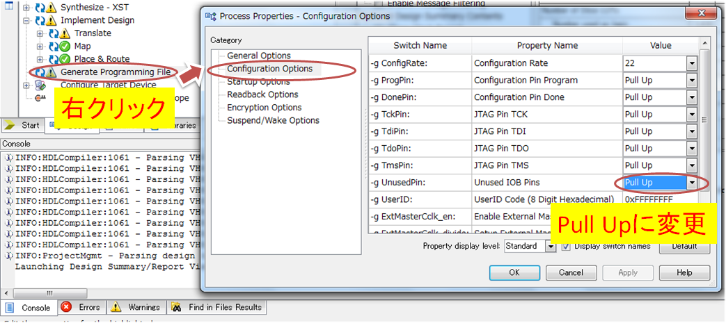 ISEで論理合成する際に、Generate Programming Fileで右クリックし、Configuration Optionsのプロパティを出し、Unused IOB PinsをPull Upに必ず変更してください。