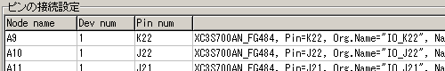 具体的には、例えば、フラッシュROMのA9(アドレスの9番)がFPGAのK22番端子につながっている場合であって、FPGAがJTAGチェーンの1番目にある場合には、Node nameはA9、Dev numは1、Pin numはK22と指定します。