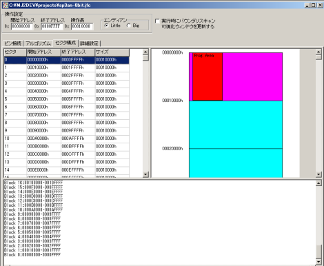 データが書き込まれたフラッシュROMを消去するには、このセクタ構成を調べなければなりません。MITOUJTAGにはそのための機能が備わっています。下の図7は、自動的に調べられたセクタ構成です。型番はST社のM29DW323DTで、アドレスの高い方に細かいセクタが配置されています。