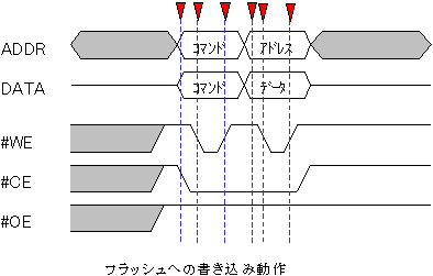 フラッシュROMではWEに書き込みパルスを与えても、スタティックRAMのようにそのアドレスで示されたメモリのセルに書き込まれるわけではありません。フラッシュROMでは、アドレスとデータバスは合わせて「コマンド」として解釈されます。特定のアドレスとデータの組み合わせの書き込み操作を行うことにより、消去や書き込み、さらには書き込みプロテクトなどの複雑なコマンドが実行される仕組みになっています。