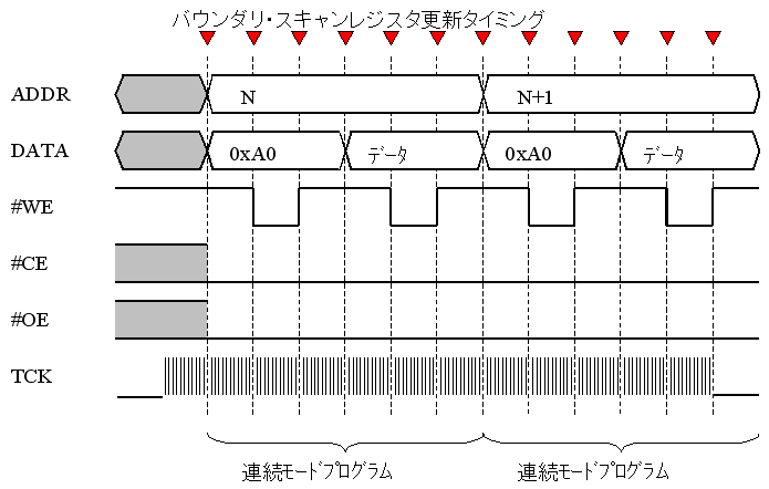 JTAGを使ってフラッシュROMを読み書きするためには、バウンダリスキャンを用いてFPGAやCPLDまたはCPUの入出力を操作し、アドレスバスやデータバスに必要なデータを乗せ、WEやCEにLのパルスを作り出すことによって行います。1ワードの書き込みを行うためには、何回か入出力の状態を更新しなければならないので、複数回のバウンダリスキャンを行うことになります。