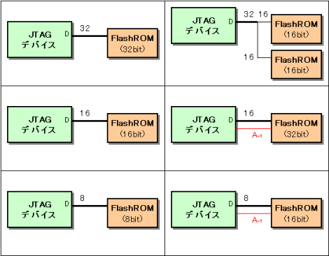 JTAGデバイスとフラッシュROMは、8bit、16bit、32bitのいずれの幅でもよく、16bit幅のフラッシュROMを2個使って32bitの幅にした場合にも対応しています。また、A-1を使用して32bitフラッシュROMを16bit幅で使ったり、16bit幅のフラッシュROMを8bit幅で使うこともできます。