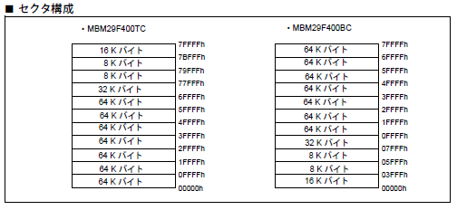 セクタ構成はフラッシュROMの種類ごとにみな異なっていて、さらにトップブートとボトムブートの区別があります。トップブートとボトムブートというのは、細かいサイズのセクタがアドレスの上位にあるか下位にあるかの違いです。