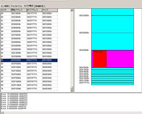 CFIコードが読みだされて、セクタ構成が表示されれば成功です。このとき、デバイスサイズや書き込みタイミングなどのパラメータも同時に取得されます。