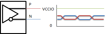 コンフィグされたFPGAでは、LVDSとして論理合成・配置配線したI/OはLVDSにはなります。P側端子のみ自由に操作でき、N側端子はP側と反対の信号を出します。振幅はLVDSなどの差動規格で定められたものになります。