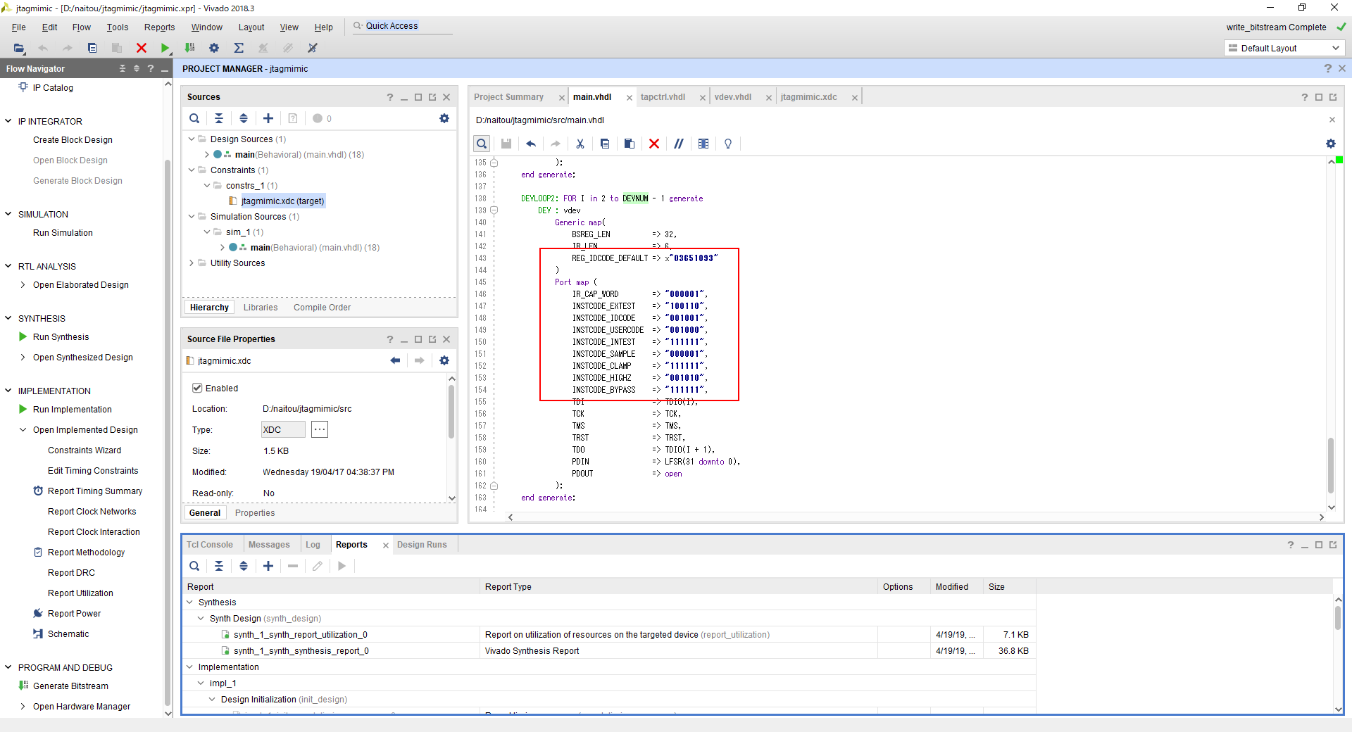 バウンダリスキャンレジスタには乱数が入るようになっています。IDCODEや、EXTESTやSAMPLEなどの命令コードはVivadoデザインの中でGenericの部分やportに定数を設定することで、任意の値に設定できます。