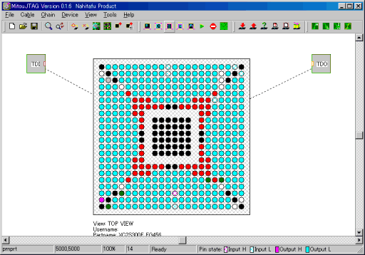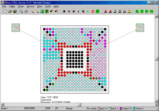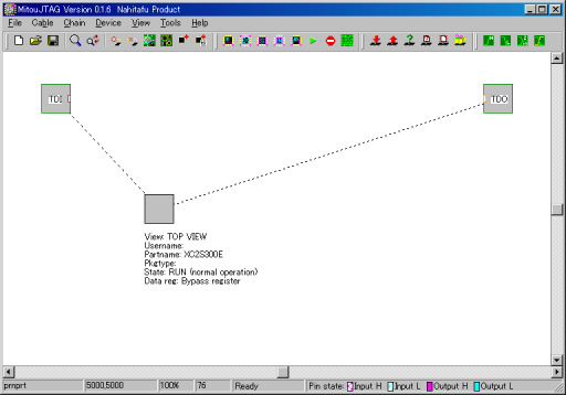 評価ボードとMITOUJTAGを実行するPCをJTAGで接続し、評価ボードの電源を入れるとXC2S300Eが認識されます。