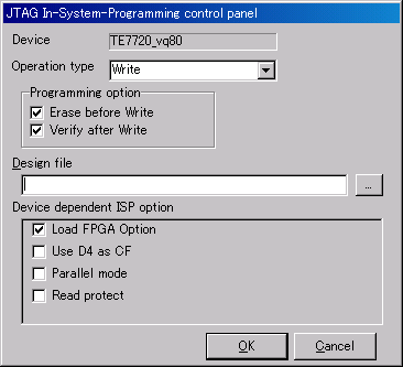 図12のダイアログが開くので、「Operation type」がWriteになっていることを確認し、Design fileの部分に書込みを行いたいbitファイル名(またはMCSファイルでも可)を指定します。なお、[...]のボタンを押すとファイルを参照することができます。