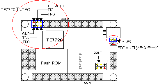 このようにチェーン接続を行うには、TE7720のTDO信号(CON2の5番ピン)を、Spartan3のTDI信号(CON7の4番ピン)に接続し、TE7720のTMSとTCKをSpartan3のTMSとTCKにそれぞれ接続します。(直結するとSpartan3の入出力の絶対最大定格を超えるので、3.3V→2.5Vへの電圧変換を行うなど、注意してください。)