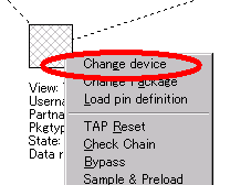 TE7720は最初、XC18V04として認識されますので、灰色の四角の上にマウスカーソルを合わせて右クリックし、プルダウンメニューが表示されたら「Change Device」を実行します。