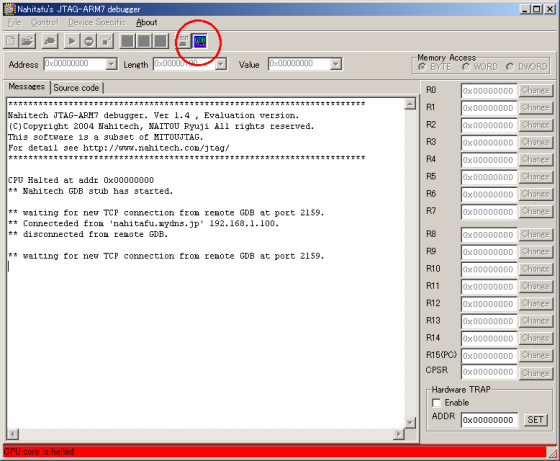 MITOUJTAGを起動し、内蔵のARM用JTAG-ICEを起動したら、ツールボタンの一番右にある「GDB」と書かれたボタンを押します。