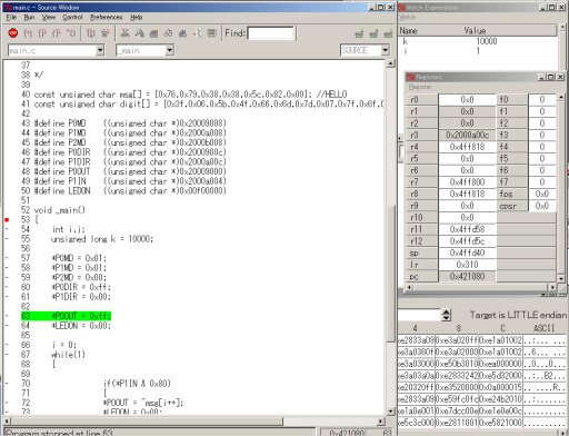 このように、GCCでコンパイルしたプログラムを、MITOUJTAGを通じてダウンロードし、GDBを用いてソースコードレベルでデバッグすることができます。