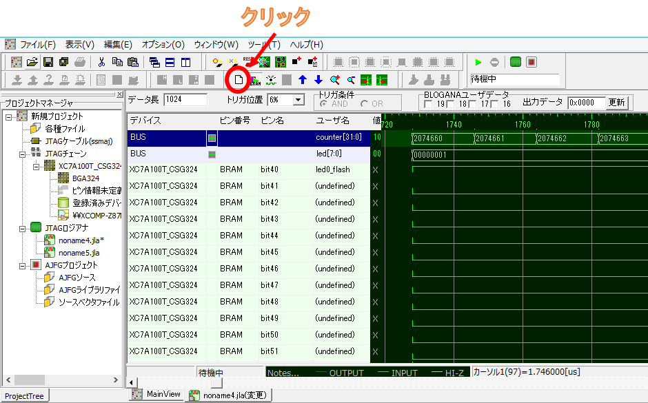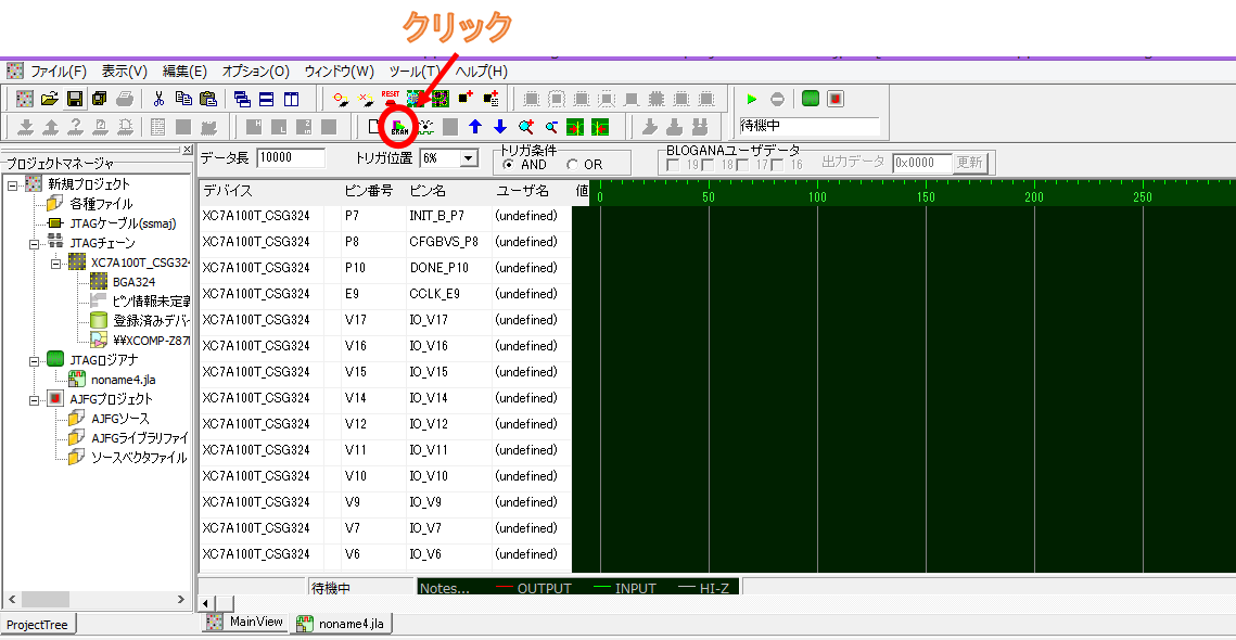 書き込みが終了したら、早速JTAGロジアナを起動します。下図の赤丸印の部分をクリックします。