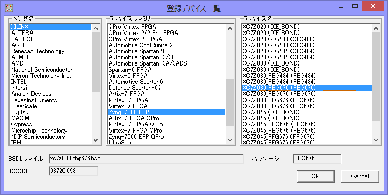 すると、MITOUJTAGに登録されているデバイスを選ぶダイアログが出るので、XILINX→Zynq-7000 EPP→XC7Z030_FBG676を選びます。