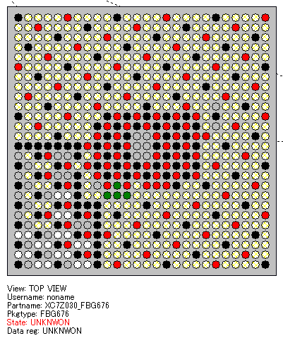 これはZYNQをTOP VIEWで見たときのピン配置ですが、電源のVCCは赤丸●で表示され、GNDは黒丸●で表示されています。クリーム色のピンは入出力I/Oピンです。