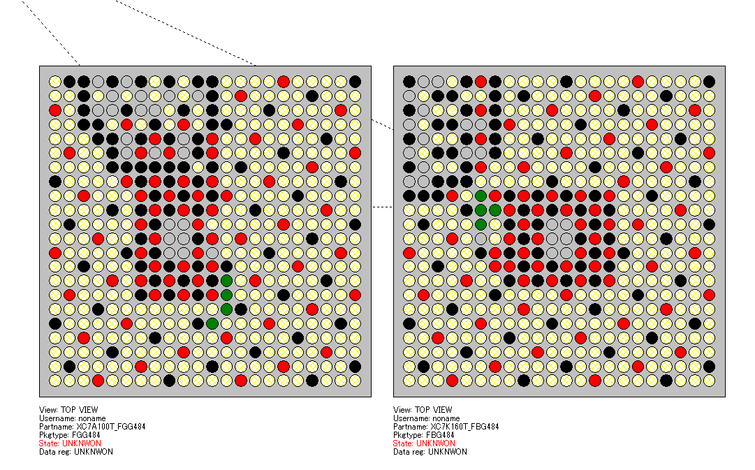 逆に、明らかにピン配置が異なってしまう例があります。たとえば、Artix-7とKintex-7はどちらも484ピンパッケージがありますが・・