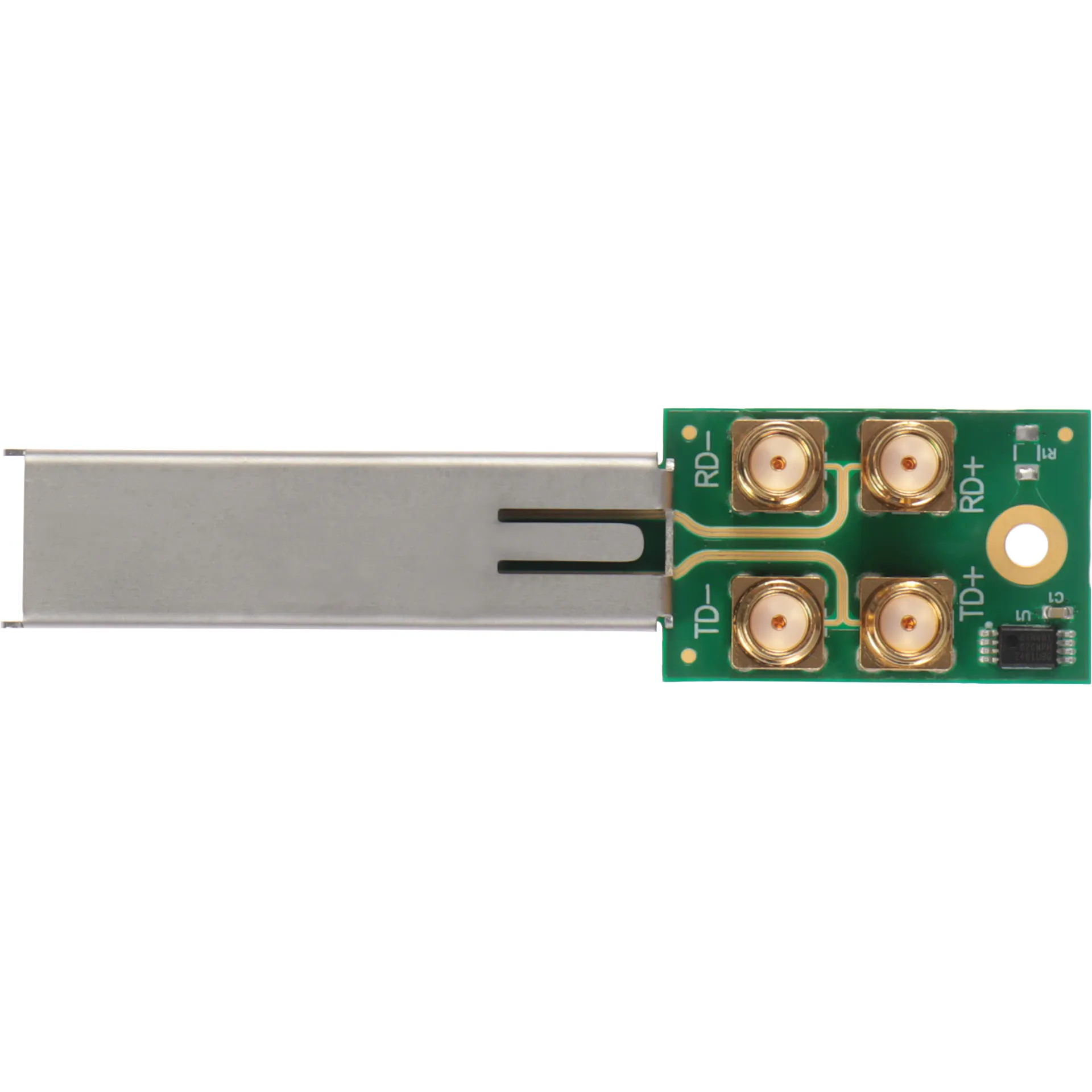The adapter is based on an impedance-controlled circuit board, ensuring clean, RF-compatible signal transmission between the SFP+ module and SMA connectors.