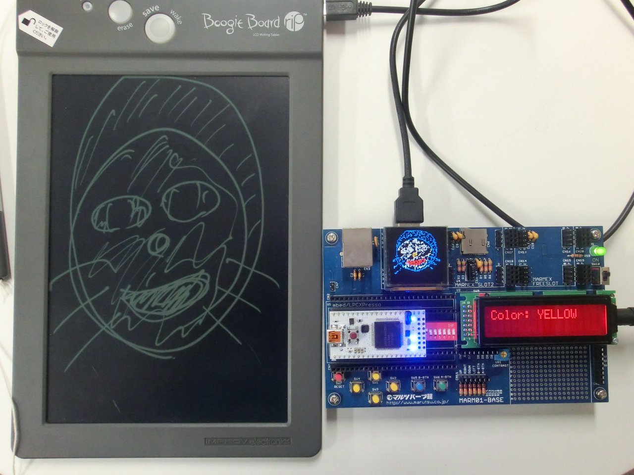 BoogieBoardという「タッチパネル式お絵かきパッド」とRaXino-iをUSBでつないで、RaXino-iにつないだOLEDに絵を表示します。なお、RX63NのUSBホスト機能を使用しています。