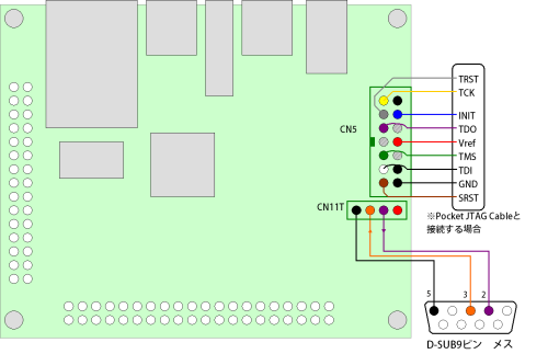 ・CN11にRS232Cの配線をつなぎ、CN5にJTAGケーブルをつなぐのが、使い勝手や動作速度などの面から考えて、最も効果的と思われます。