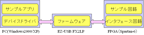 本評価ボードは、USB2.0 HighSpeedインタフェース用にCypress社製のEZ-USB FX2LPを搭載しています。これまでEZ-USB FX2LPを使った高性能なアプリケーションを開発するにはUSBに対する深い知識とノウハウが必要でしたが、本ボードで提供するデバイスドライバやファームウェア、さらにFPGA内のインタフェース回路(IPコア)とサンプルアプリをご活用いただくことで、お客様はUSBまわりの設計で手を煩わせることなく、ホストPCと通信するアプリケーションを迅速に開発していただくことができます。このため、高速なデータ収集・制御システムの開発をとても簡単に行えます。