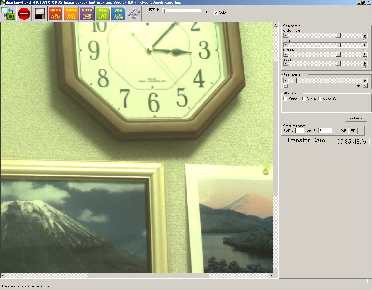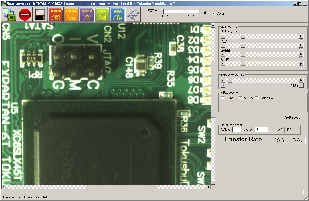 このソフトウェアでは、画像のとりこみと、解像度の変更、RGBゲイン、露出の調整、および画像の保存が可能です。また、MT9T031の任意のレジスタに値を書き込む機能がありますので、思う存分カメラレジスタを操作していただけます。