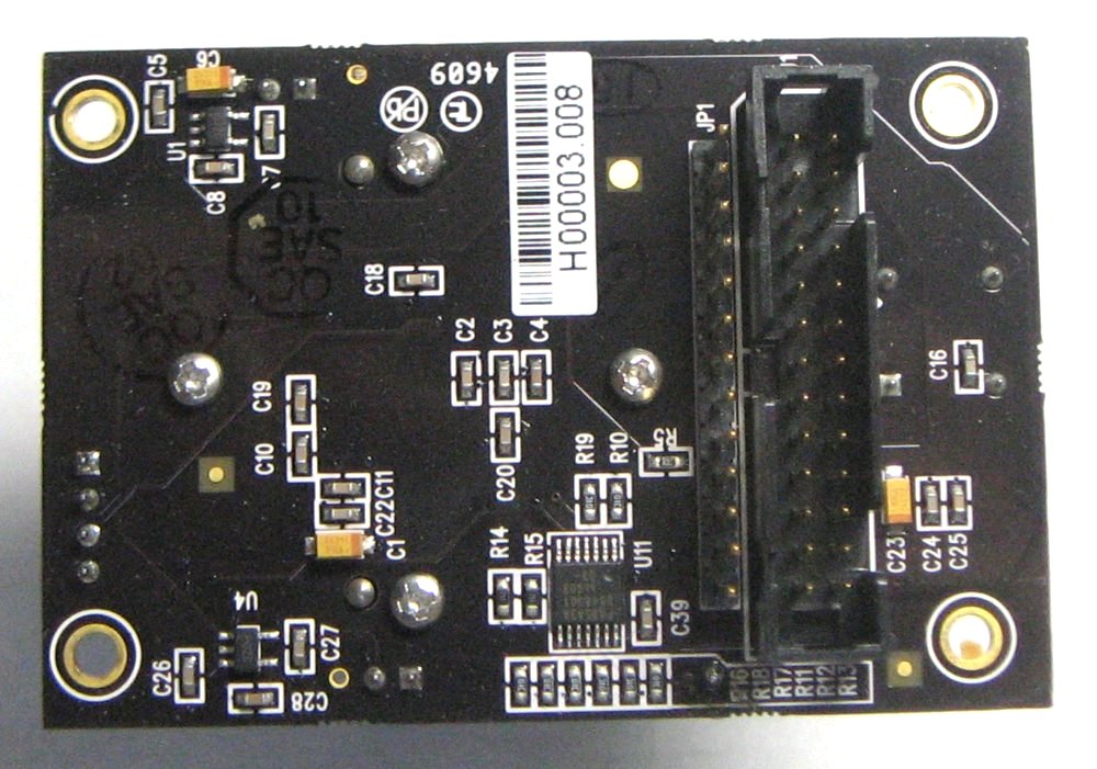 MT9T031C12STCHに実装されているピンヘッダにはJ1(ボックス付きのピンヘッダ)とJP1(むき出しのピンヘッダ)がありますが、必要な信号はすべてJ1から出ています。Aptinaのイメージャは、データバスが8bit〜16bitのものがあるようですが、MT9T031は10bitなので、J1のピンヘッダだけすべての信号が取りだせます。