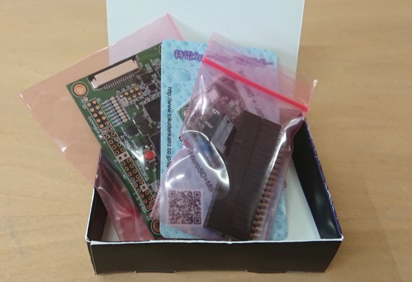 パッケージを開封すると、基板本体のほか、ピンヘッダセットとピン配置が記されたカードが同梱されています。